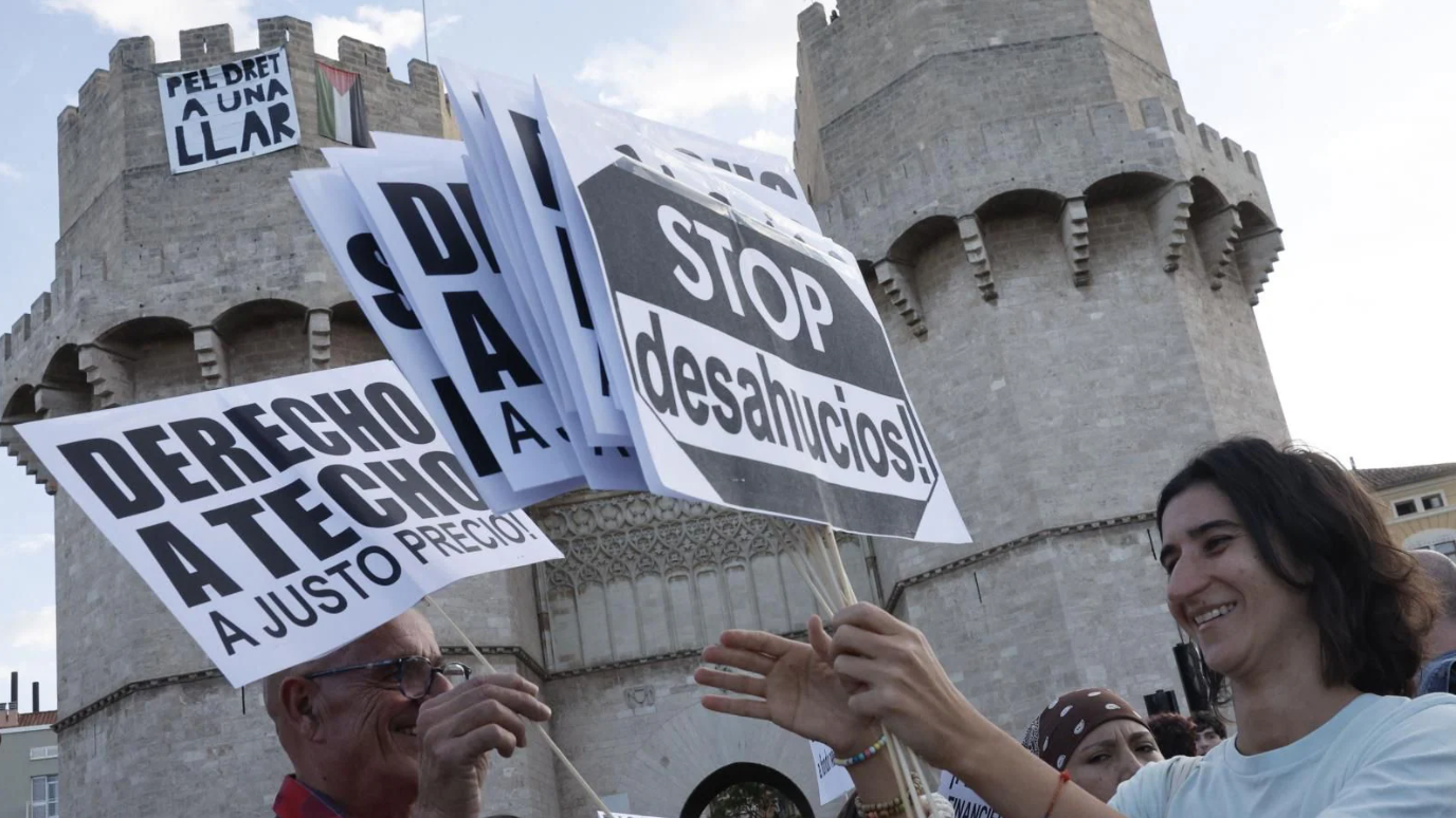 La marcha, organizada por diversas asociaciones vecinales, culturales y partidos políticos como el PSPV-PSOE, Compromís, CCOO PV y Sumar, se dividió en cuatro columnas que convergieron en las Torres de Serranos. Allí, los manifestantes desplegaron una pancarta gigante con el lema «por el derecho a un hogar» y una bandera palestina, que fueron retiradas por la Policía Nacional.